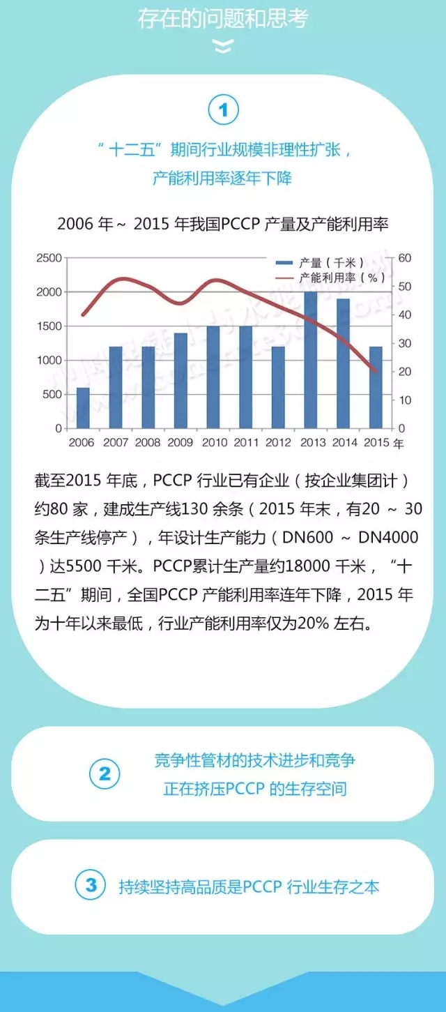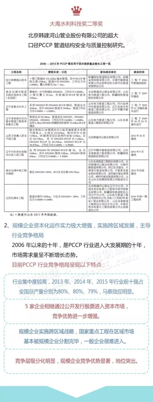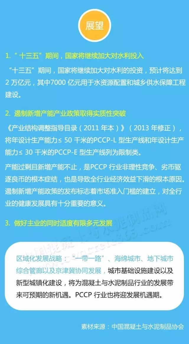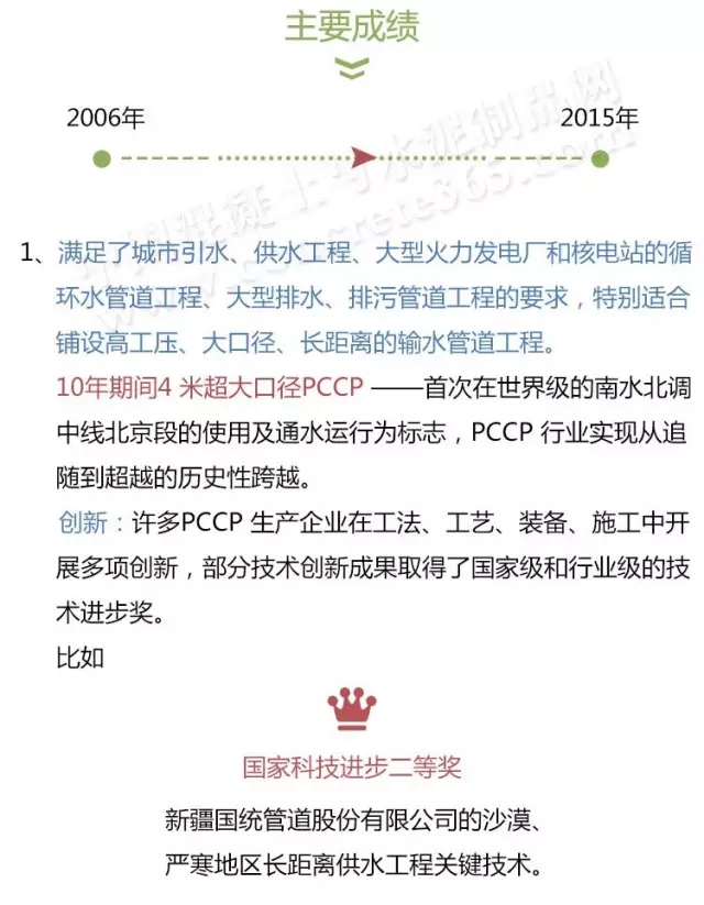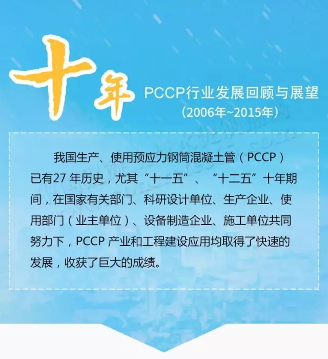 PCCP行業(yè)發(fā)展的十年回顧(2006年----2015年)我國生產(chǎn)、使用預(yù)應(yīng)力鋼筒混凝土管(PCCP)已有27年歷史,尤其"十一五"、"十二五"十年期間,在國家有關(guān)部門、科研設(shè)計(jì)單位、生產(chǎn)企業(yè)、使用部門(業(yè)主單位)、設(shè)備制造企業(yè)、施工單位共同努力下,PCCP產(chǎn)業(yè)和工程建設(shè)應(yīng)用均取得了快速的發(fā)展,收獲了巨大的成績。