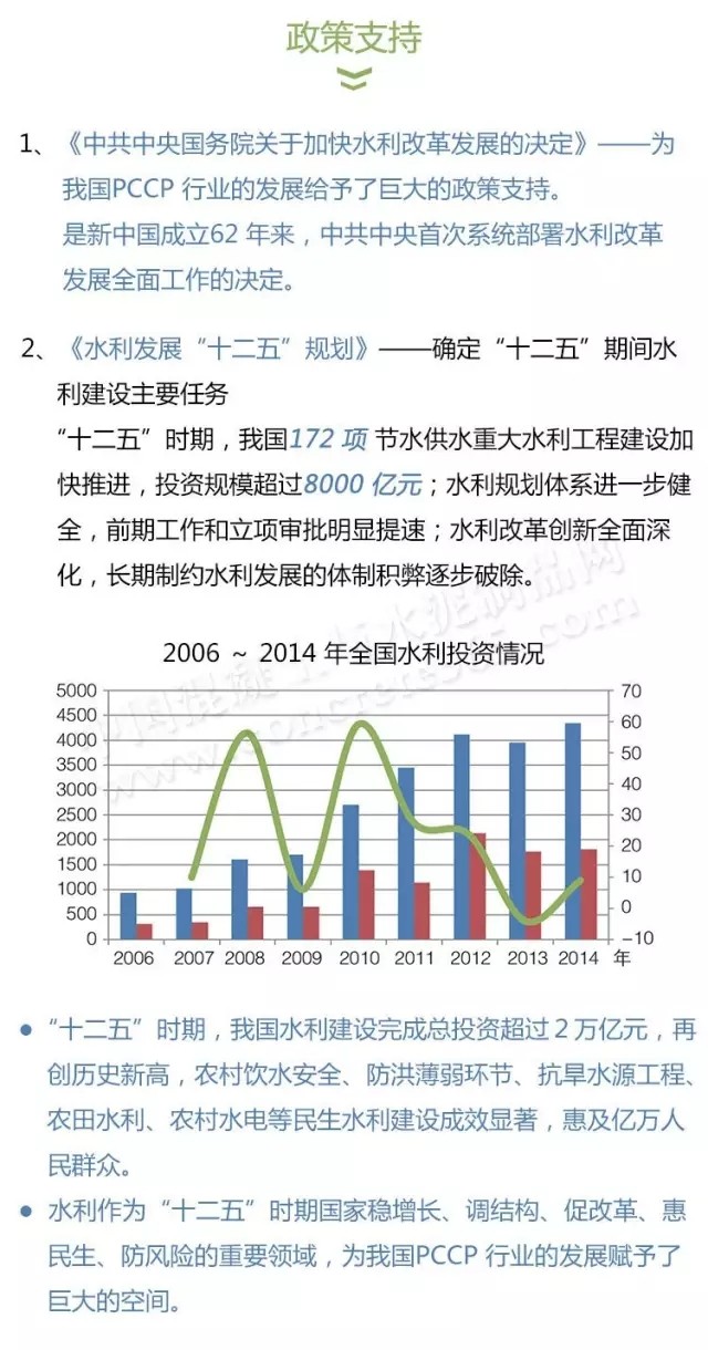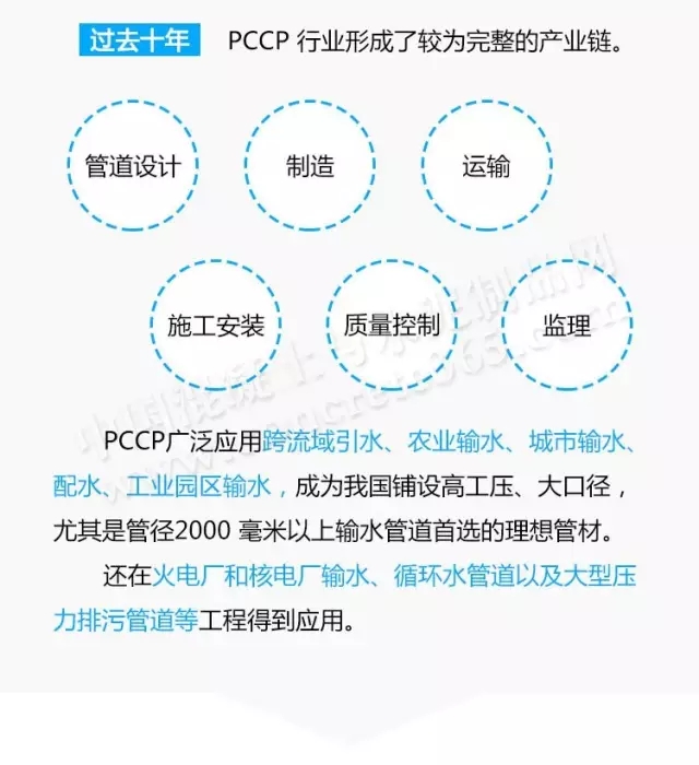 PCCP行業(yè)在過去十年間,形成了管道設(shè)計(jì)、制造、運(yùn)輸、施工安裝、質(zhì)量控制、監(jiān)理等較為完整的產(chǎn)業(yè)鏈;PCCP不僅廣泛應(yīng)用于跨流域引水、農(nóng)業(yè)輸水、城市輸水、配水、工業(yè)園區(qū)輸水,成為我國鋪設(shè)高工壓、大口徑,尤其是管徑2000毫米以上輸水管道理想管材,而且還在火電廠和核電廠輸水、循環(huán)水管道以及大型壓力排污管道等工程得到應(yīng)用。