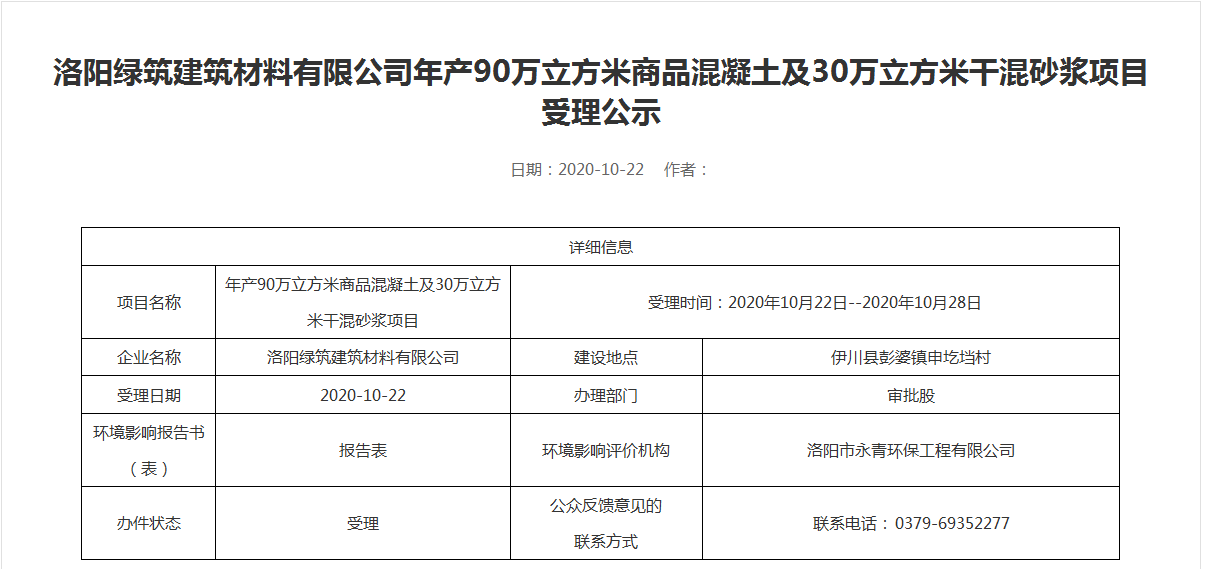 洛陽綠筑建筑材料有限公司年產(chǎn)90萬立方米商品混凝土及30萬立方米干混砂漿項目受理公示