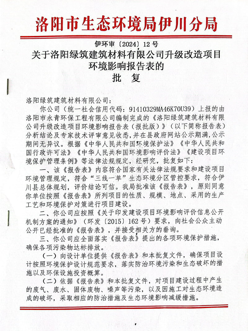 關(guān)于洛陽綠筑建筑材料有限公司升級(jí)改造項(xiàng)目環(huán)境影響報(bào)告表的批復(fù)