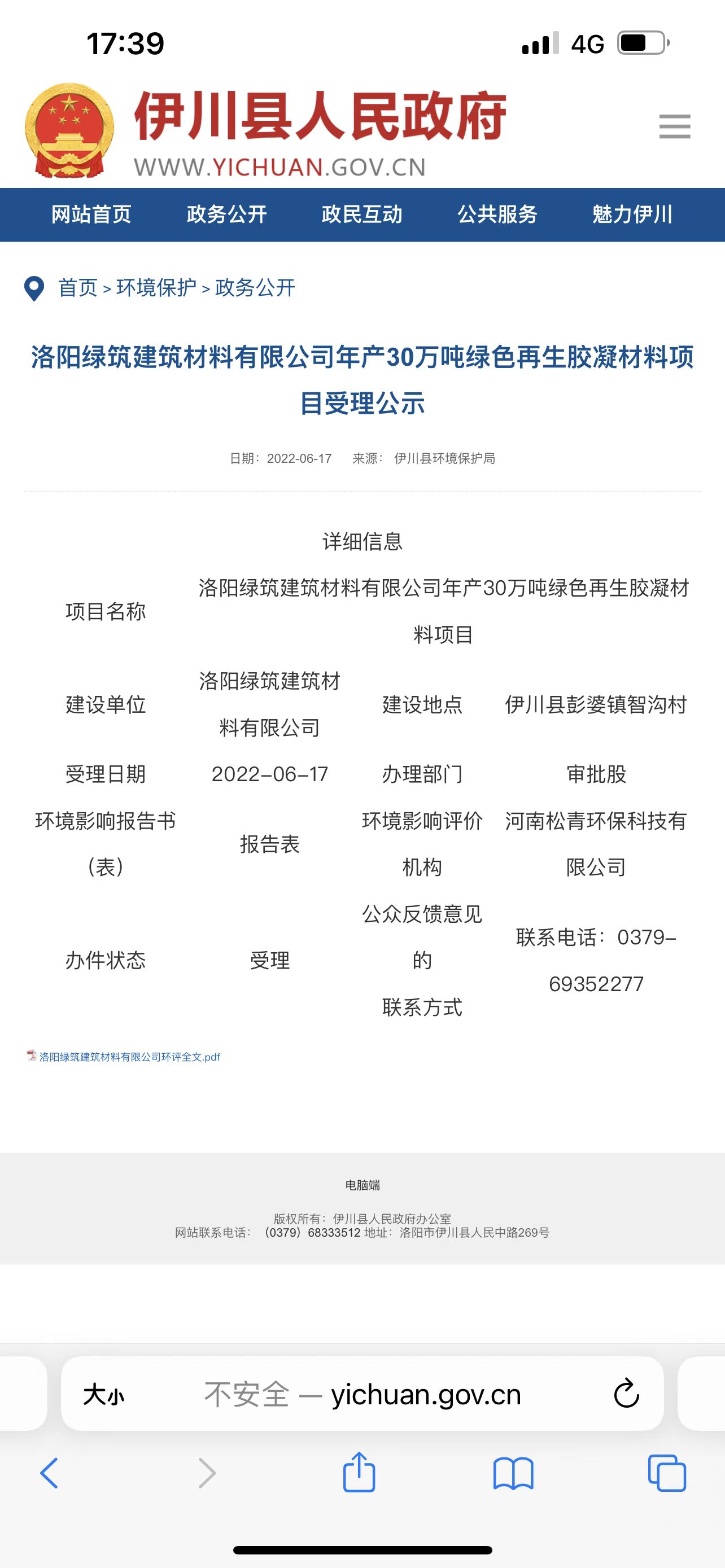 洛陽綠筑建筑材料有限公司年產(chǎn)30萬噸綠色再生凝膠材料項目受理公示