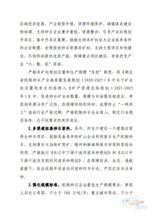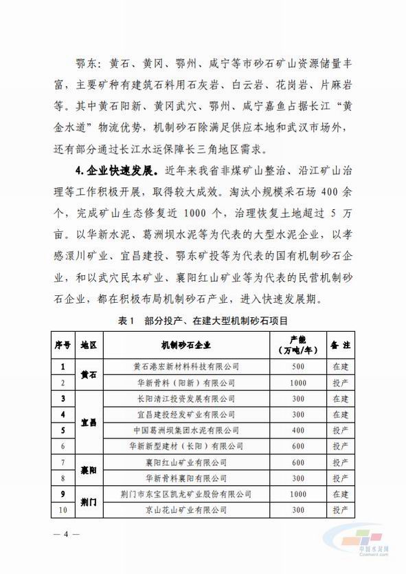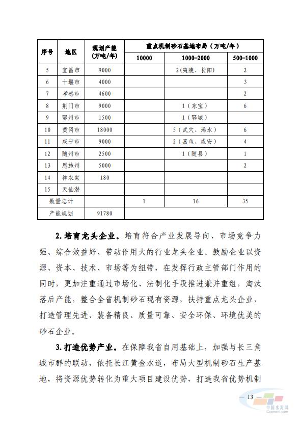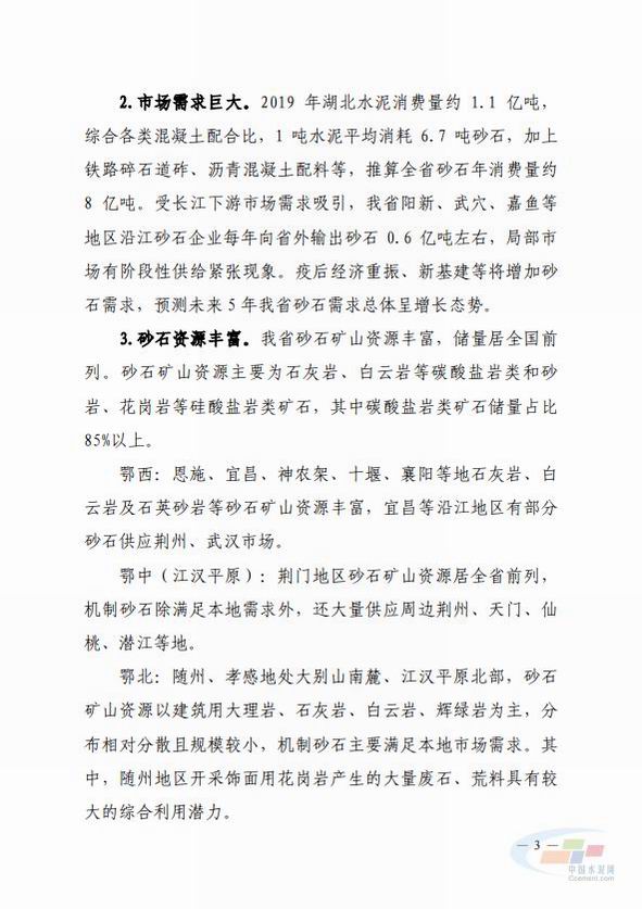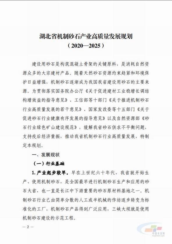 近期,湖北省工信廳印發(fā)了關(guān)于《湖北省機(jī)制砂石產(chǎn)業(yè)高質(zhì)量發(fā)展規(guī)劃(2020-2025)》的通知。據(jù)悉,疫情經(jīng)濟(jì)重振、新基建等將增加砂石需求,預(yù)測未來5年湖北省砂石需求總體呈增長態(tài)勢。目標(biāo)到2025年,全省機(jī)制砂石年產(chǎn)能達(dá)到9.9億噸以上,其中機(jī)制砂年產(chǎn)能4億噸以上,實(shí)現(xiàn)湖北省砂石產(chǎn)業(yè)可持續(xù)發(fā)展。
