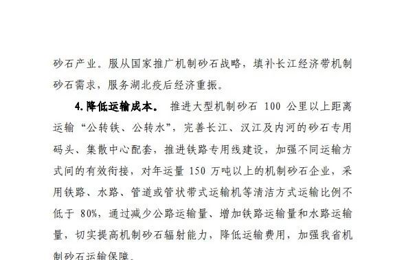 降低運(yùn)輸成本。完善水運(yùn)網(wǎng)絡(luò)和港口集疏體系建設(shè),加快推進(jìn)布局砂石集散中心和鐵路專用線建設(shè);對年運(yùn)量150萬噸以上的機(jī)制砂石企業(yè),根據(jù)企業(yè)需要,按規(guī)定建設(shè)鐵路專用線。
